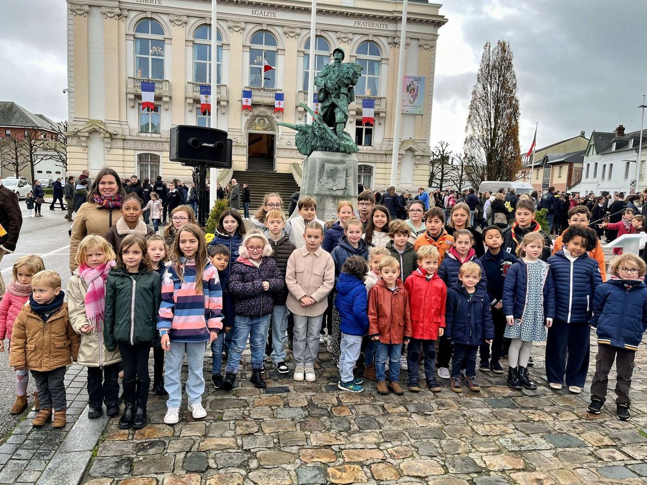 Les écoliers de l'école Saint Michel se sont mobilisés, en ce 11 novembre 2025, pour assister à la cérémonie de la commémoration du 11 novembre en déposant une gerbe de" fleurs au nom de notre école.