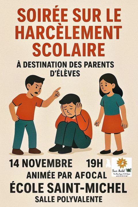 Nous proposerons aussi aux parents d'élèves, une soirée débat, le vendredi 14 novembre, sur la thématique du harcèlement.